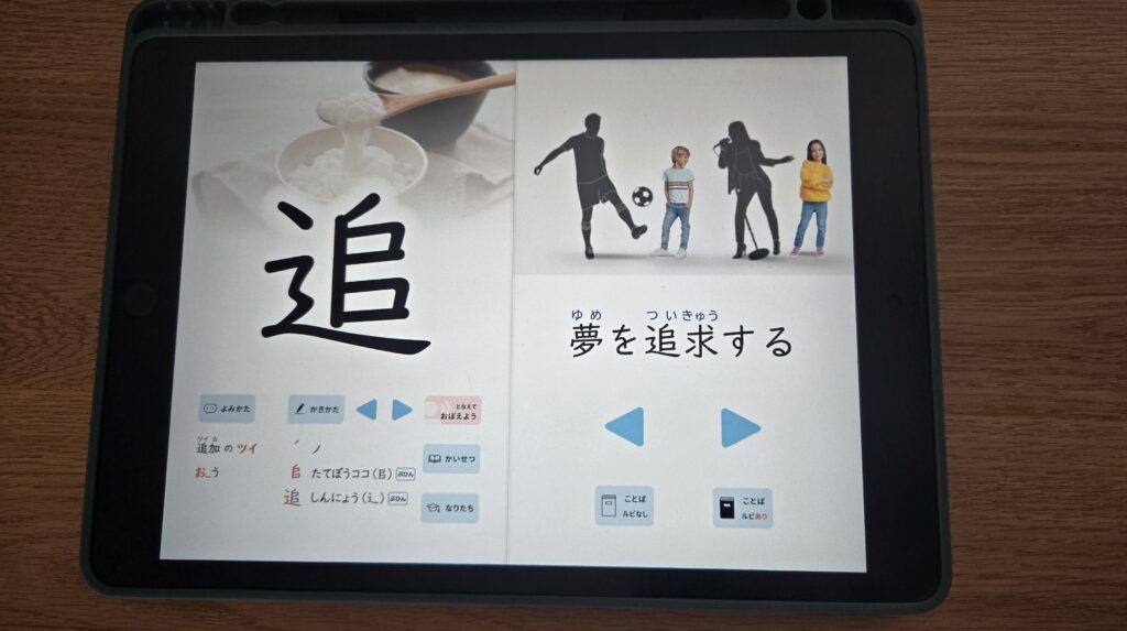 これは私のサポートありで使っていて、たとえばこの「夢を追求する」といった抽象的な語句が出てきたときは娘との対話を心掛け中。けっこう時間を取られる学習法になってるけど、ミチムラ式を始めてから娘は学校の漢字テストでほとんどミスしなくなった。