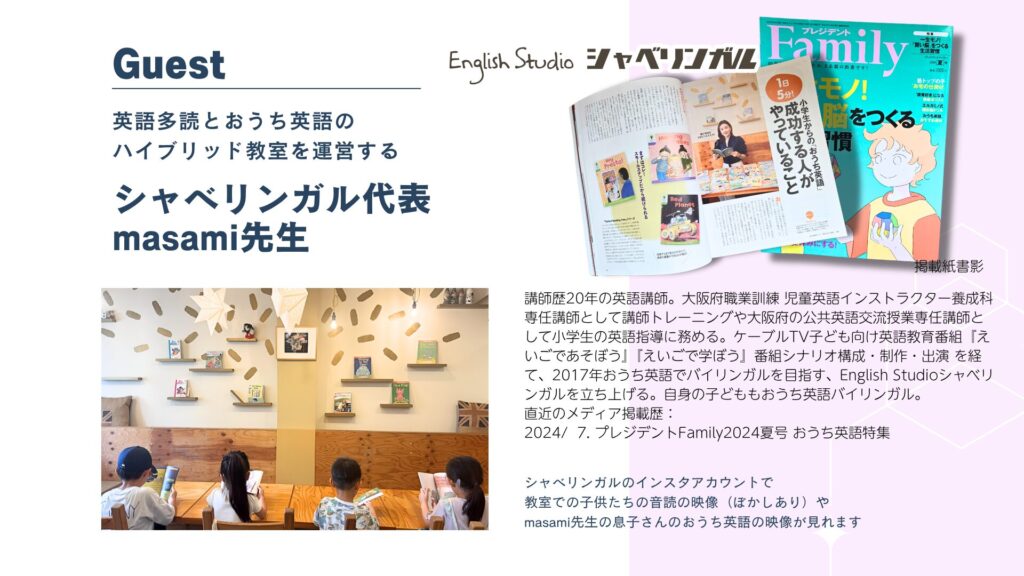 詳しく知りたい方は、シャベリンガル代表をゲストにおうちえいご園コミュニティで開催したイベントの録画を購入してご覧ください。録画視聴価格は2,200円です。