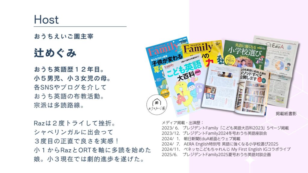 おうち英語歴12年目で、現在小3と小5の子どもとともにおうち英語をやっています。